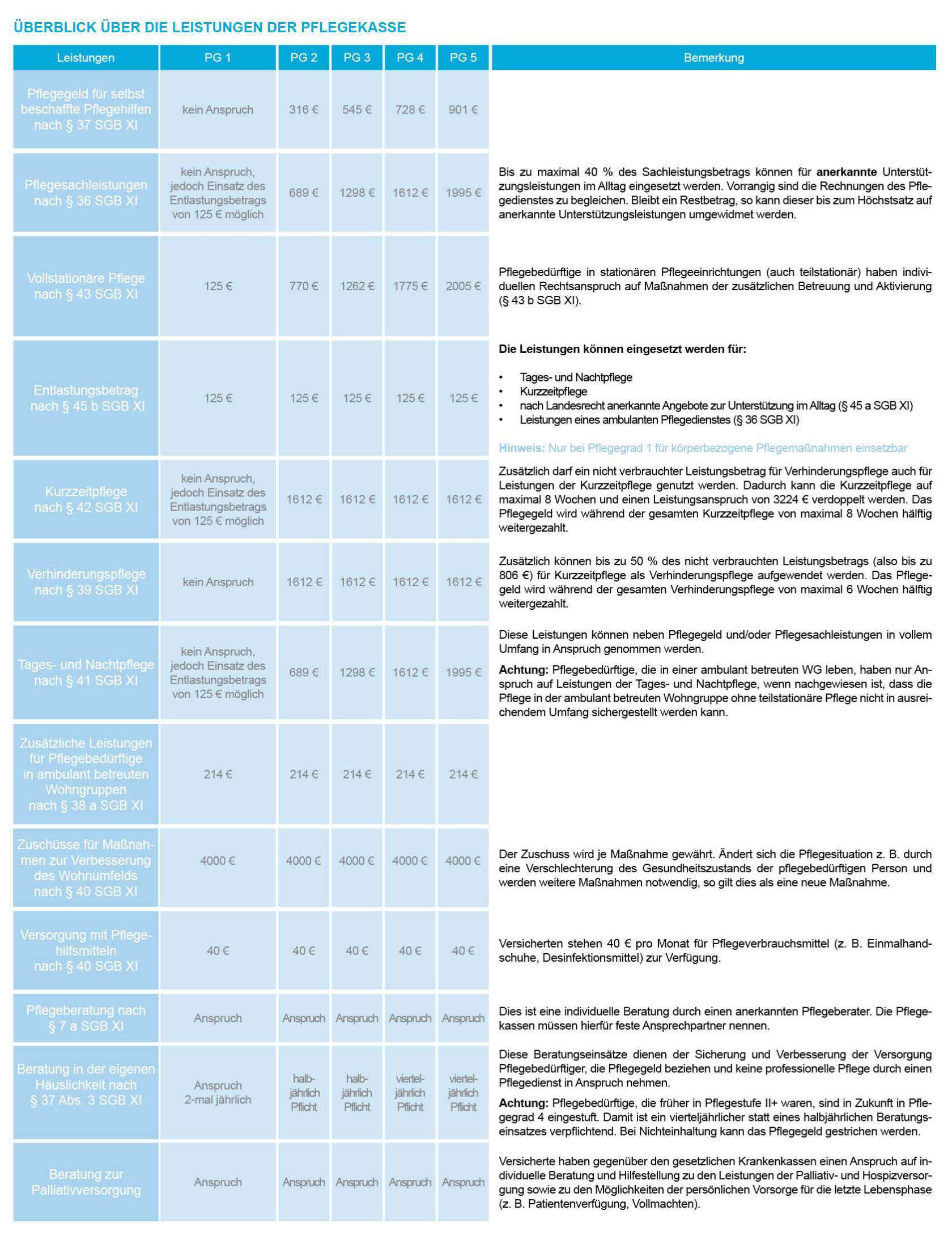 Wie in der Tabelle ersichtlich gibt es fünf Pflegesgrade mit zugeordneten Leistungen.